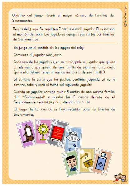 Este juego es una adaptación del famoso juego de las familias, donde tenías que conseguir el mayor número de familias. En este caso será lo mismo, pero con los elementos significativos de los Sacramentos.